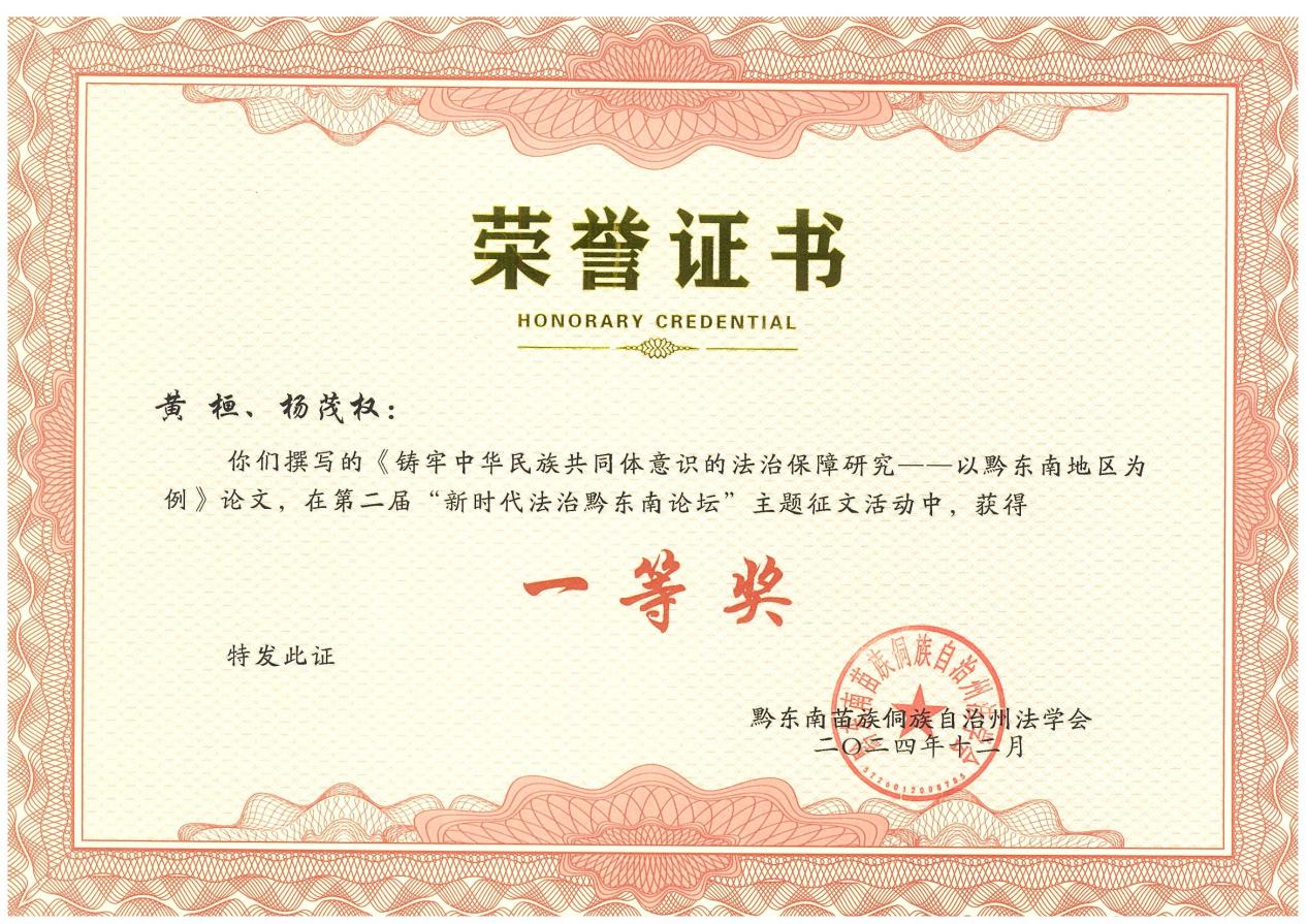 黃(huáng)桓、楊茂權、張存浩三位律師(shī)在第二屆“新時(shí)代法治黔東(dōng)南(nán)論壇”主題征文(wén)活動中分(fēn)"别榮獲“一(yī)等獎”和(hé)“優秀獎”